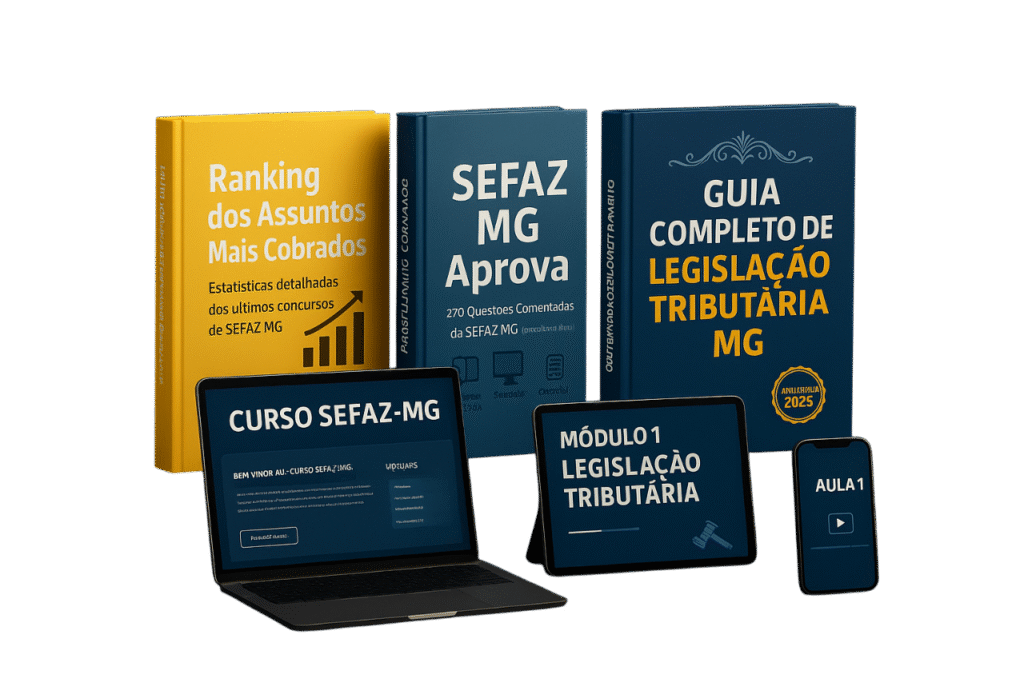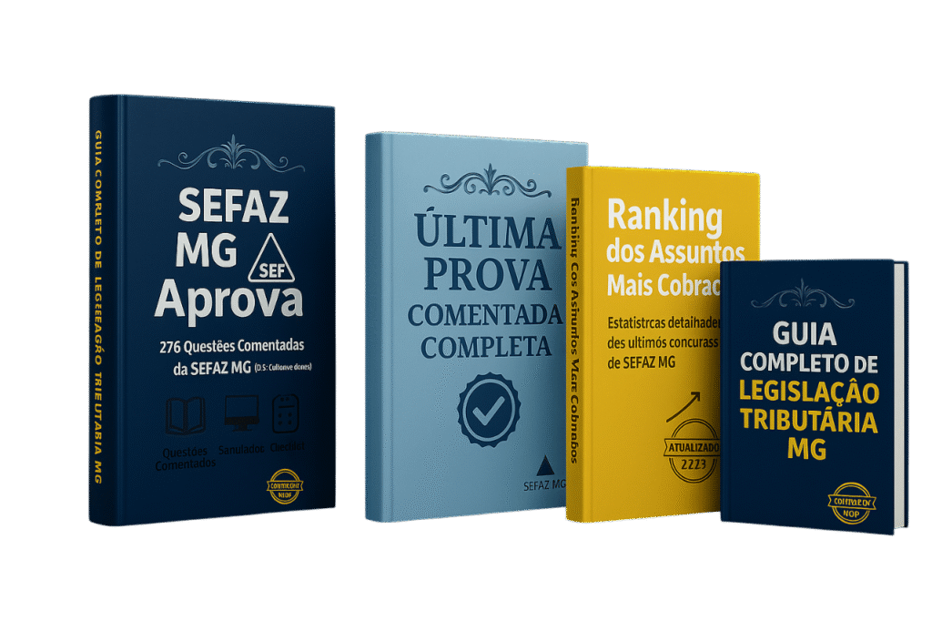 Este PDF reúne +276 questões comentadas da SEFAZ MG, organizadas nos temas mais cobrados — direto ao ponto, sem enrolação.